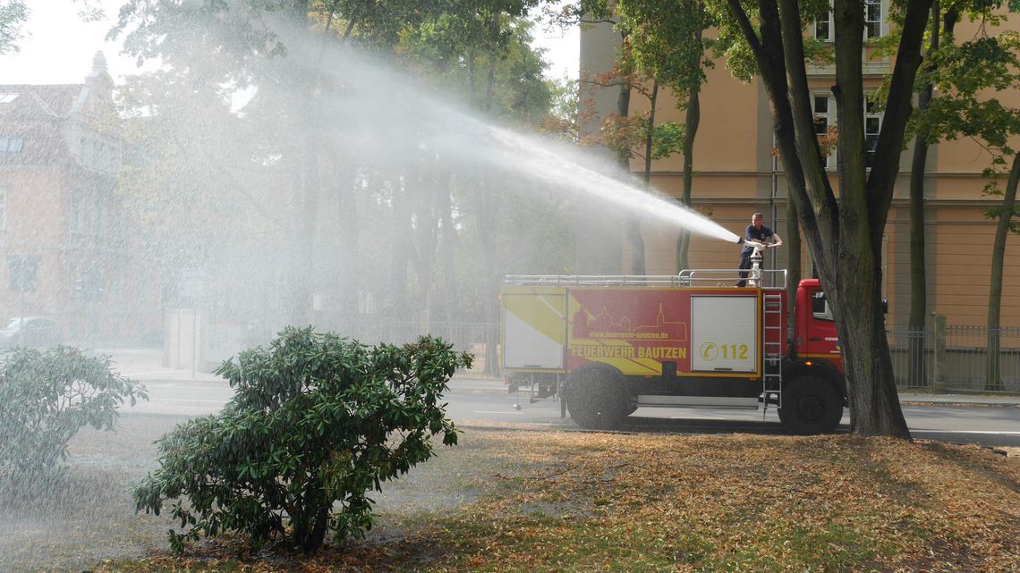 Um das Flüssigkeitsdefizit auszugleichen, ist die Bautzener Berufsfeuerwehr seit heute im Einsatz. Sie wässert die Bereiche. Nach Aussage von Fachleuten wird ein Effekt aber erst nach mehreren Tagen eintreten können. Darum wird man die Feuerwehr wohl demnächst öfter in den Anlagen antreffen. In diesem Zusammenhang wird darauf hingewiesen, dass die Feuerwehr kein Leitungs- sondern Brunnenwasser verwendet. So sehr das heiße Wetter auch zu einer kalten Dusche für Mensch und Tier verleiten mag, in diesem Fall wird davon abgeraten.