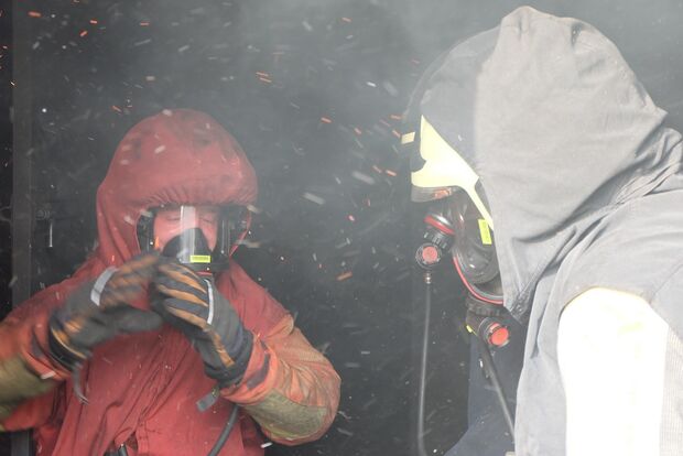 Station 2 beschäftigte sich mit dem Absuchen von Brandräumen, dem Retten von Personen und einer kleinen Kriechstrecke. Alles wurde begleitet von echter Hitze, Nullsicht und Brandrauch. Abschließend wurde das Löschen in Räumen trainiert, insbesondere der Umgang mit dem entstehenden Wasserdampf. Dazu wurde auch das Ableiten von Brandrauch/Wasserdampf mittels der hydraulischen Ventilation trainiert.