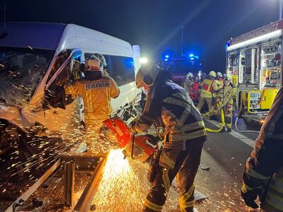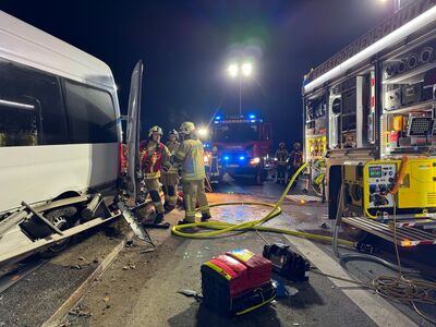 Beim Eintreffen der ersten Rettungskräfte wurde sofort die Patientenbetreuung / Patientensichtung eingeleitet. Es handelte sich um einen vollbesetzten Kleinbus. Neun Personen wurden teils schwer verletzt. Des Weiteren wurde der Fahrer des Fahrzeuges im Beinbereich eingeklemmt. Er wurde mit technischem Gerät befreit. Zusätzliche Schwierigkeit war, dass das Fahrzeug im Beifahrerbereich frei in der Luft schwebte.