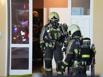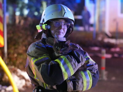 Parallel dazu ging ein Trupp unter Atemschutz über das Treppenhaus vor, um eine Personensuche durchzuführen und eine weitere Rauchausbreitung im Gebäude zu verhindern. Dabei wurde eine Katze aufgefunden und ins Freie gebracht, wo sie von einer Kameradin der Feuerwehr betreut wurde.