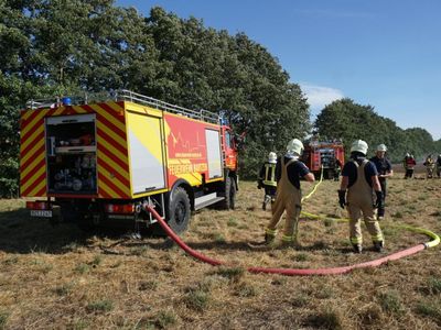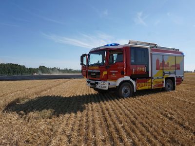 Daher wurden vier Tanklöschfahrzeuge (TLF) nachgefordert, um genügend Löschwasser vor Ort zu haben. Unter anderem kam auch das TLF der Berufsfeuerwehr zum Einsatz. Die Feldränder wurden gewässert um eine weitere Ausbreitung zu verhindern. Unser TLF speiste die die bereits arbeitenden Löschfahrzeuge vor Ort ein.